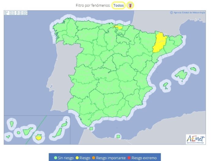 La inestabilización de la atmósfera con chubascos y tormentas, que comenzarán ya el viernes 25 de agosto, se incrementarán e intensificarán este sábado, y sobre todo, el domingo. No obstante, se quedarán al margen de estas precipitaciones los archipiélagos de Baleares y Canarias.
