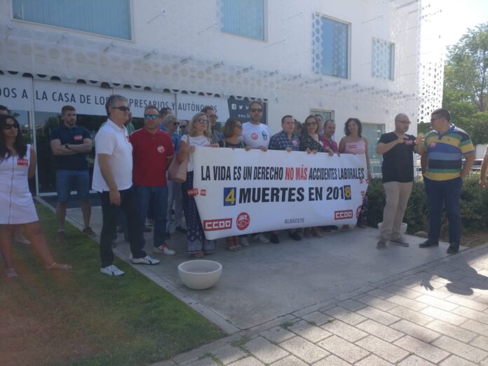 UGT y CCOO se han manifestado este miércoles frente a la sede de la Confederación de Empresarios de Albacete (FEDA) para reclamar unos centros de trabajo seguros y saludables, con motivo del fallecimiento de dos trabajadores en la provincia.