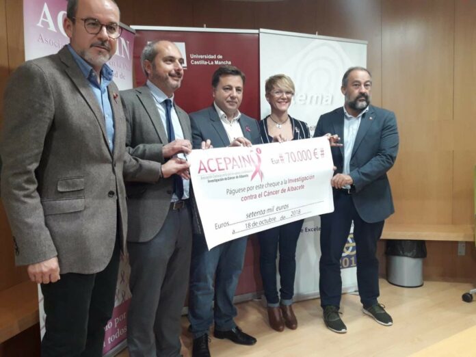 La Asociación Costuras en la Piel en Apoyo a la Investigación de Cáncer en Albacete, Acepain, ha entregado un cheque con 70.000 euros a la Universidad de Castilla-La Mancha para que se continúe con los trabajos de investigación contra el cáncer.