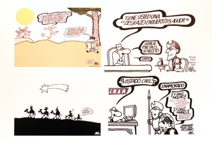En la muestra puede verse una pequeña selección de las muchas viñetas que en su larga trayectoria realizó el humorista gráfico, escritor, director de cine y televisión, y colaborador radiofónico, Antonio Fraguas de Pablo ‘Forges‘ (1942-2018) basadas en el Quijote y sus personajes, a través de la cual hace una crítica, en muchos casos humorística, de la sociedad, la política o la economía, y siempre desde un claro compromiso con los derechos y libertades de la ciudadanía.