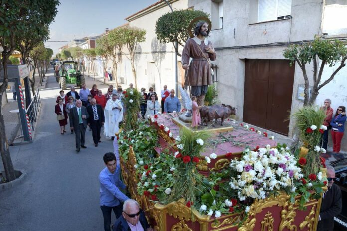 A las 18.30 h. salía la imagen del santo de la Iglesia San Juan Bautista al son del himno nacional, interpretado por la banda de la Agrupación Musical “Maestro Martín Díaz”, y tras de ella el párroco local, Ángel Almansa, junto a representantes del Gobierno municipal, de la Cooperativa Agraria Ntra. Sra. de Peñarroya y de los sindicatos agrarios, a los que se sumaron en la calle Cervantes numerosos tractores de todas las edades, modelos y diseños, muchos de ellos repletos de personas, sobre todo niños y niñas.