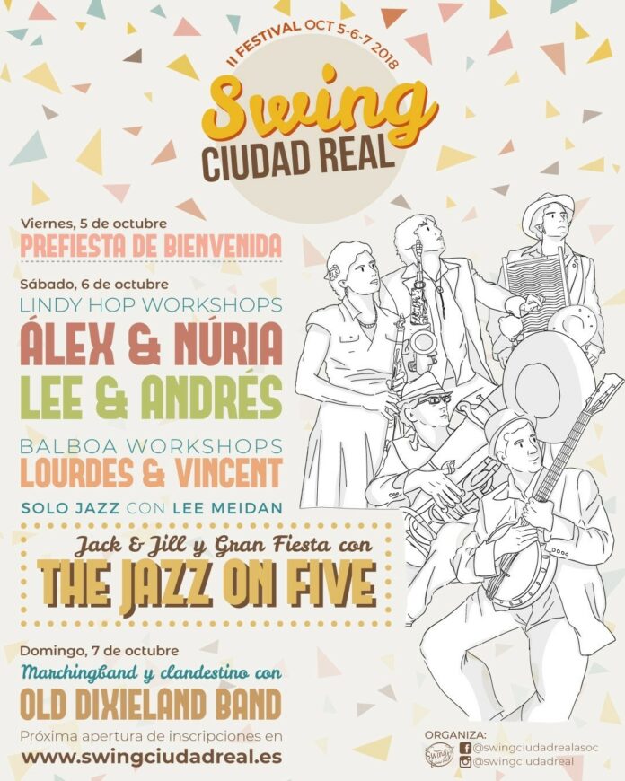 El primer fin de semana de octubre es la fecha elegida para la celebración del II Festival Swing Ciudad Real. Tras una primera edición, en formato Exchange, que contó en 2017 con más de 150 personas venidas de diferentes puntos del país, con los profesores Carla Stinus y Carlos Cayuela y las bandas Basement Band y Old Dixieland Band, esta edición tendrá un formato de gran Festival de Swing.