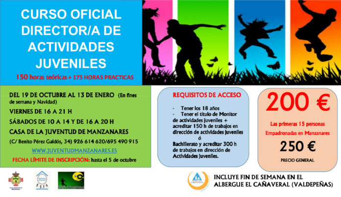 El área de Juventud del Ayuntamiento de Manzanares tiene abierto el plazo de inscripción para la acción formativa ‘Curso oficial director/a de actividades juveniles’. Hasta el 5 de octubre, las personas interesadas que cumplan los requisitos pueden inscribirse en la Casa de la Juventud.