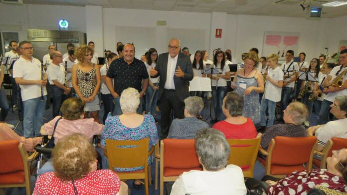 En uno de sus últimos conciertos al frente de la banda manzanareña, Delegido dirigió a su nutrida plantilla para llevar un trocito de la feria hasta la residencia, donde alguna usuaria no se resistió a bailar un pasodoble.