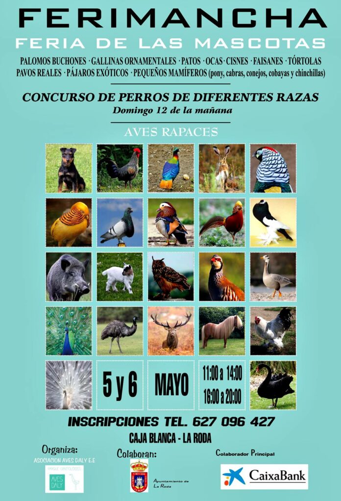 Bajo la organización de la Asociación de Aves Daly E.E. (Educación y Enseñanza) y con la colaboración del Ayuntamiento de La Roda y CaixaBank de San Clemente,  La Roda y comarca podrá disfrutar de una muestra en la que podrán verse aves rapaces, cisnes, faisanes, patos, cocas, pavos reales, gallinas ornamentales, pájaros exóticos, etc.; así como ponis, cabras, conejos, cobayas y chichillas.