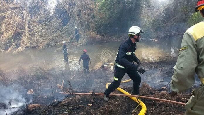Gracias a su rápida intervención lograron controlar un incendio de vegetación en la ribera del río, cerca de la Presa de las Canas, en la pedanía hellinera de Agra.