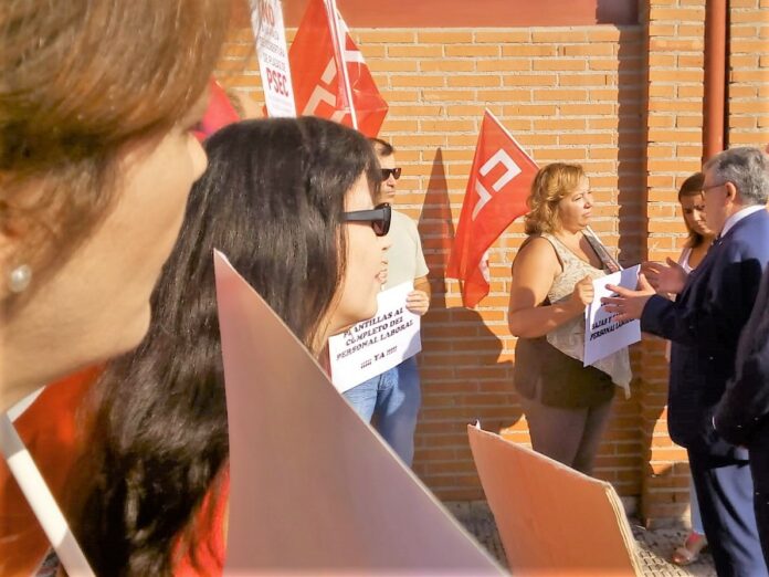 Una veintena de trabajadoras y trabajadores de los IES de Talavera de la Reina ‘San Isidro’ y ‘Ribera del Tajo’ se han concentrado esta mañana ante las puertas de este último centro educativo con motivo de la vista del consejero de Educación, Ángel Felpeto; al que le han expresado con pancartas, pitos y cánticos su malestar por la no cobertura de vacantes entre el personal laboral de limpieza, ordenanzas y mantenimiento.