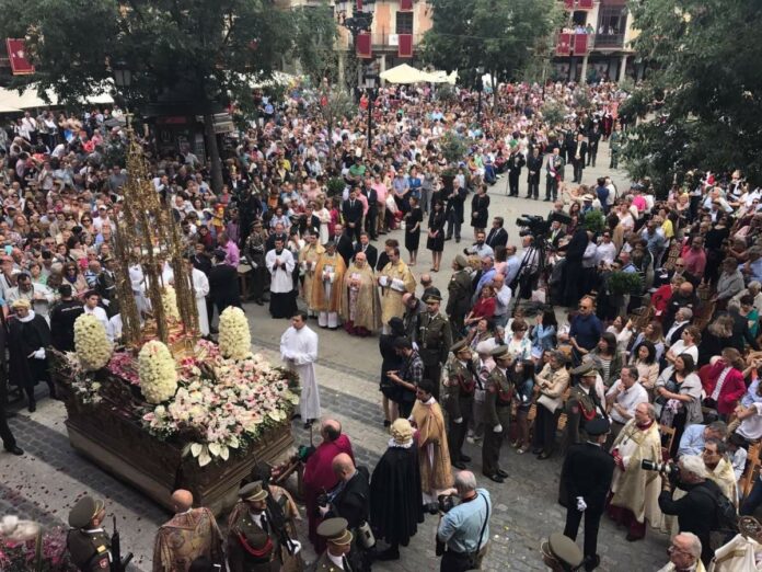 La festividad del Corpus Christi, declarada de Interés Turístico Internacional, con la Custodia de Arfe como protagonista, se ha vivido este jueves en Toledo con gran ambiente en la calle, como ocurre todos los años, y con olor a tomillo y romero que como es tradición se esparcen por todo el recorrido procesional durante el amanecer.