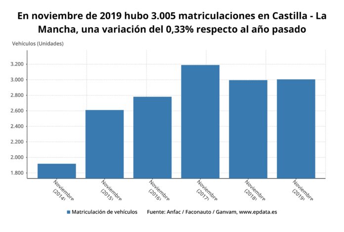 Por su parte, la provincia de Cuenca ha tenido un total de 206 matriculaciones por las 212 del anterior mes de noviembre, plasmando una variación negativa del 2,83%; y en la de Guadalajara se han llevado a cabo 365 matriculaciones por las 418 de noviembre de 2018, con una caída del 12,68%.