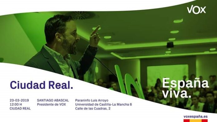 El presidente nacional de Vox, Santiago Abascal, protagonizará este sábado, 23 de marzo, en el Paraninfo de Ciudad Real un acto de precampaña con afiliados y simpatizantes.