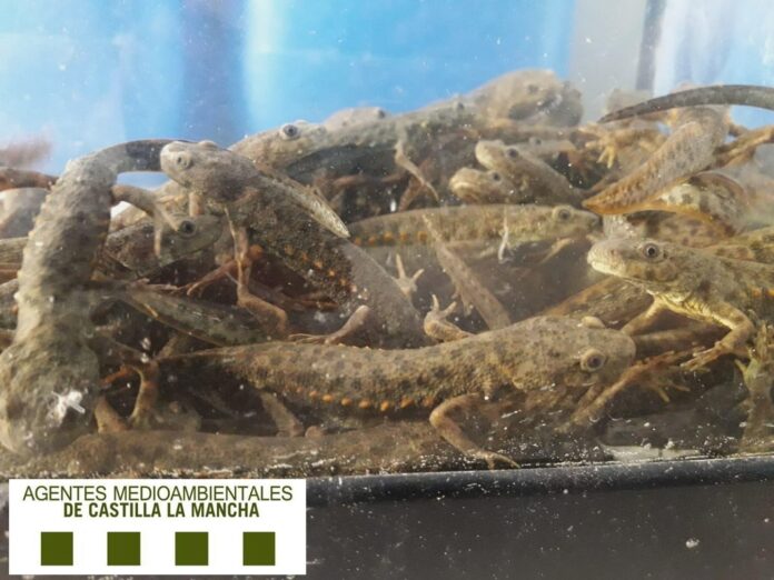 Agentes Medioambientales de Castilla-La Mancha han rescatado más de cien tritones que se hallaban en el interior de una piscina privada de Almorox (Toledo), cuyo agua llevaba más de tres años sin depurar.