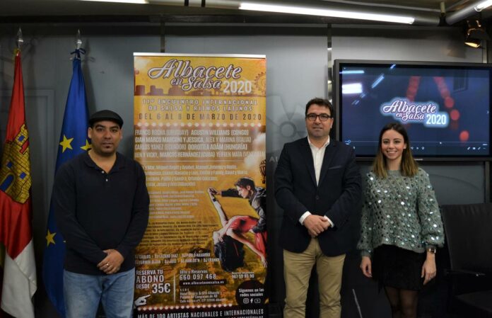 El concejal de Promoción de la Ciudad, Modesto Belinchón, junto al presidente de la Asociación Cultural ‘Amigos de Cuba’, Orlando González; y la directora de la Escuela de baile ‘Miguel Ángel y Anabel’, Anabel Navarro, han presentado esta mañana en rueda de prensa la undécima edición el Encuentro Internacional de Salsa y Ritmos Latinos ‘Albacete en Salsa 2020’, que acogerán el Palacio de Congresos y el Hotel Beatriz entre los días 6 y 8 de marzo.
