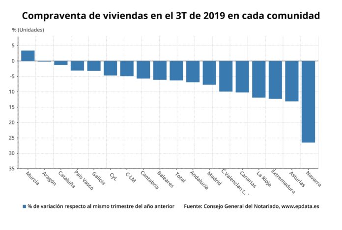 La única comunidad que incrementó la compraventa fue Murcia, con un 3,4% más, y solo Aragón y Cataluña registraron un descenso inferior al 2% (-0,2% y -1,3%, respectivamente). En Navarra (-26,5%), Asturias (-13,1%), Extremadura (-12,3%), La Rioja (-11,9%) y Canarias (-10,2%) las bajadas fueron superiores al 10%.