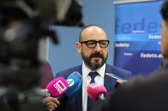 El eurodiputado de Ciudadanos, Jordi Cañas, junto al presidente del grupo parlamentario de Cs en C-LM, Alejandro Ruiz y el diputado regional de Cs Toledo, David Muñoz, han mantenido una reunión con FEDETO con Manuel Madruga, secretario general de la federación a la cabeza.