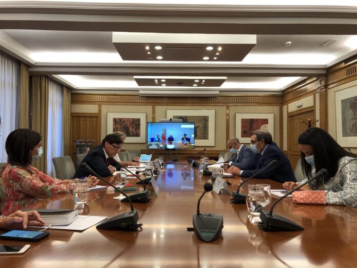 El encuentro por vía telemática con los consejeros de Castilla-La Mancha, Jesús Fernández, de la Comunidad de Madrid, Jesús Ruiz Escudero, y de Castilla y León, Verónica Casado, ha tenido lugar al término del Consejo Interterritorial del Sistema Nacional de Salud (CISNS), en la que se ha analizado la vuelta al colegio y los rastreadores militares.