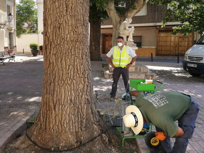 La Concejalía de Medio Ambiente de Argamasilla de Alba ha comenzado a utilizar la técnica de la endoterapia para el control de plagas en el arbolado urbano, consistente en la inyección de la materia activa directamente al tronco del árbol, evitando así realizar pulverizaciones aéreas que pueden afectar al medio ambiente y a los usuarios de las zonas verdes. El insecticida, a través del sistema bascular del árbol, se distribuye hasta las hojas, provocando la muerte del insecto cuando se alimenta de ellas.