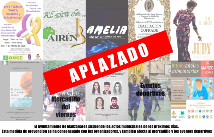 Pendiente de las instrucciones a recibir por parte de la Federación Española de Municipios y Provincias (FEMP) y de las autoridades sanitarias, el Ayuntamiento de Manzanares ha acordado suspender las actividades municipales a celebrar estos días. Se trata de una medida de prevención sanitaria consensuada con los distintos organizadores ante las recomendaciones realizadas para evitar la propagación del coronavirus. Entre otros, se suspende el mercadillo de este viernes.