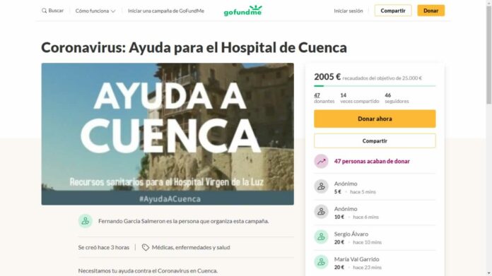 En las últimas horas, a través de la página web gofundme.com, una iniciativa impulsada por Fernando García Salmerón en beneficio del Hospital Virgen de la Luz de Cuenca ha recaudado casi 2.000 euros para destinarlos al centro hospitalario de cara a ayudar a sus profesionales ante el repunte en el ritmo de trabajo por la pandemia de coronavirus.