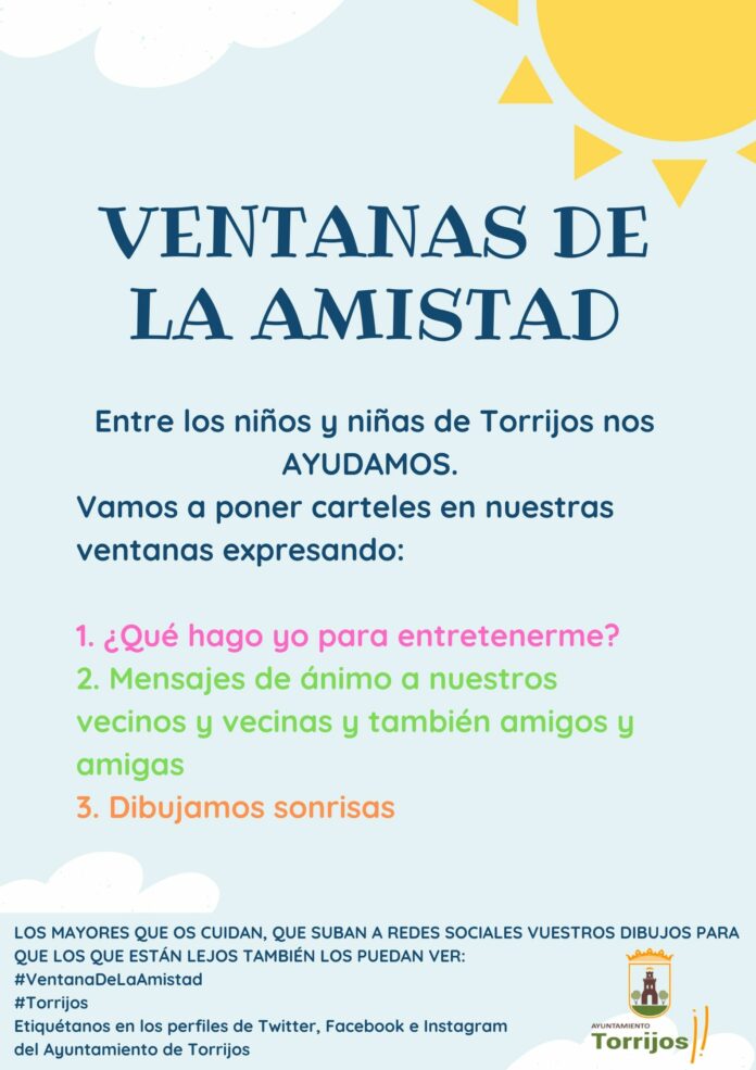 El consistorio torrijeño, a través de su concejalía de Infancia, Juventud, Educación y Festejos, propone esta iniciativa 2.0 mediante la que invita a los niños y niñas de la localidad a realizar carteles en los que puedan dibujar sonrisas, trasladar mensajes de ánimo a los demás y contar qué hacen ellos para entretenerse. El objetivo es que después muestren esos carteles al resto de la población en sus ventanas y balcones y que sus progenitores los publiquen también en las redes sociales con los hashtag “VentanaDeLaAmistad y #Torrijos, etiquetando al Ayuntamiento de Torrijos.