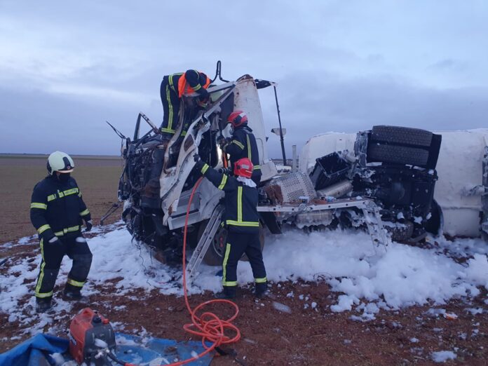 Toda la dotación del Parque de Bomberos que el Servicio Especial de Prevención y Extinción de Incendios de la Diputación de Albacete tiene en La Roda, el jefe del propio SEPEI (Francisco Ovidio García Ríos) y otro equipo al volante del vehículo de riesgo químico del Parque ubicado en Villarrobledo, han intervenido en la mañana de este lunes, 25 de enero, en el accidente que ha sufrido un camión que transportaba mercancía peligrosa (concretamente, gasoil y gasolina).