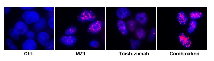 Este estudio recién publicado se centra en otro subtipo de cáncer de mama, denominado HER2 positivo, uno de los más agresivos. «Se evaluó la sinergia de MZ1 con el anticuerpo Trastuzumab, que se usa como tratamiento de pacientes de este subtipo de cáncer, y los resultados de la investigación mostraron cómo la combinación de ambos fármacos es sinérgica, aumentando el efecto de ambos fármacos por separado, lo que nos muestra un alto potencial anticancerígeno», indican.