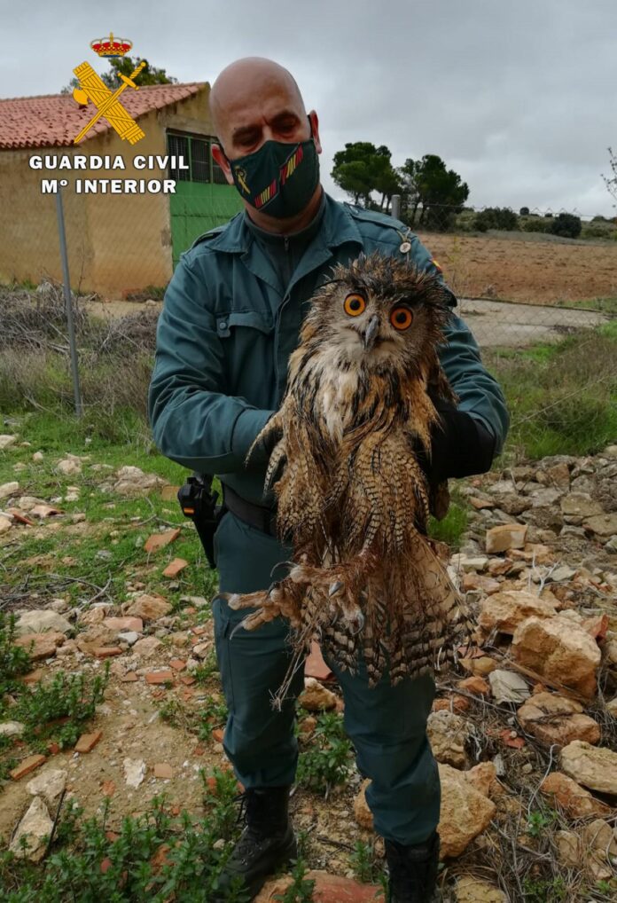 Efectivos de la patrulla del SEPRONA de la Guardia Civil de Almansa procedieron a la captura e inmovilización de un ejemplar de Búho Real herido que un vecino de Almansa había localizado es un conocido paraje del término municipal almanseño.