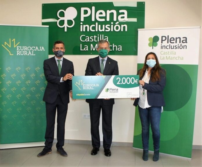 Al acto de entrega de esta aportación asistieron el presidente de la Fundación Eurocaja Rural, Javier López Martín, el director gerente de Plena inclusión CLM, Daniel Collado, y la directora económica de Plena inclusión CLM, Esther Sánchez Escobar.