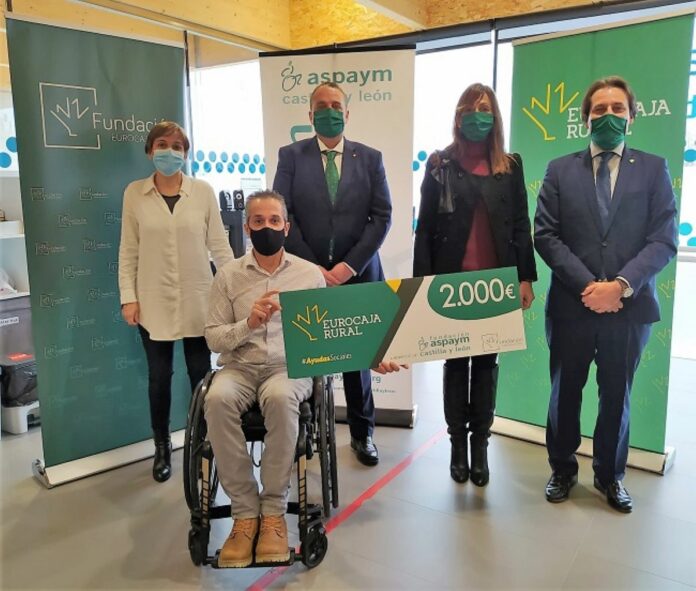 La Fundación Eurocaja Rural ha entregado a Aspaym Castilla y León (Asociación de personas con lesión medular y otras discapacidades físicas), un cheque valorado en 2.000 euros como beneficiaria de la segunda convocatoria de ‘Ayudas Sociales Frente al COVID-19’, en concreto la relativa a la categoría ‘Atención Sanitaria, Sociosanitaria y Tercera Edad’, y a la que optaron finalmente más de 70 proyectos de todo el ámbito de actuación donde opera la entidad financiera: Castilla-La Mancha, Madrid, Valencia, Murcia y la provincia de Ávila.
