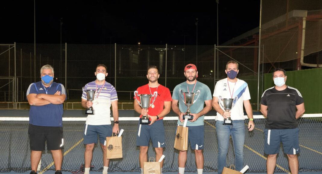 La entrega de los premios a los cuatro mejores tenistas del maratón la realizaron el concejal de Deportes, José Antonio Navarro, y el gerente de Cronos Argamasilla de Alba, Antonio Marín.