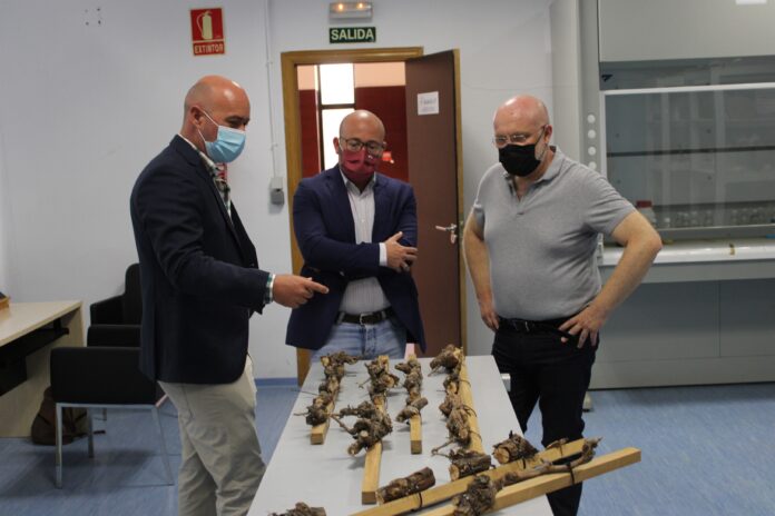 El delegado de la Junta en Albacete, Pedro Antonio Ruiz Santos, y el delegado provincial de Agricultura, Agua y Desarrollo Rural, Ramón Sáez, así lo han puesto de manifiesto este martes, durante la visita que han realizado a la empresa ‘Agrokap’, ubicada en el Polígono Industrial de Campollano, en la ciudad de Albacete, que junto a la Universidad de Castilla-La Mancha (UCLM) y la Sociedad Cooperativa Campo de San Isidro de Ledaña (Cuenca), han presentado uno de estos proyectos pilotos, basado en la aplicación de un Protocolo contra la enfermedad Yesca, en viñas de secano de la variedad Bobal.