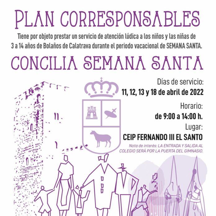 Un año más, el Ayuntamiento de Bolaños de Calatrava, a través del área de la Mujer, organiza dentro del programa Concilia, que se enmarca en el plan ‘Corresponsables’, un servicio lúdico y gratuito de atención a menores de 3 a 14 años durante los días no lectivos de Semana Santa y en horario escolar.
