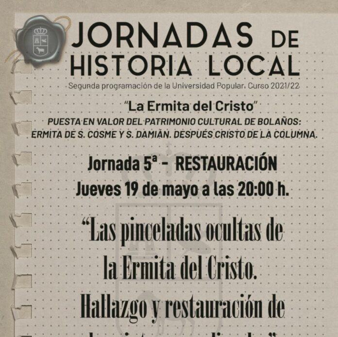 El Ayuntamiento de Bolaños junto al Archivo Municipal y la Universidad Popular lleva organizando durante todo este mes unas Jornadas de Historia Local impartidas por profesionales que profundizan en la historia y descubrimientos de la Ermita de San Cosme y San Damián, después Cristo de la Columna. Dividida en seis conferencias, la penúltima jornada abordará “Las pinceladas ocultas de la Ermita del Cristo. Hallazgo y restauración de las pinturas medievales”, a cargo de Dª Giuliana Medda, conservadora y restauradora de bienes culturales, este jueves, a las 20:00 horas, en el citado lugar.