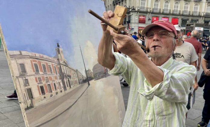 El pintor hiperrealista manchego es un clásico del verano madrileño, ya que no es la primera vez que abandona su estudio para pintar desde el corazón de Madrid y retratar así sus paisajes urbanos.