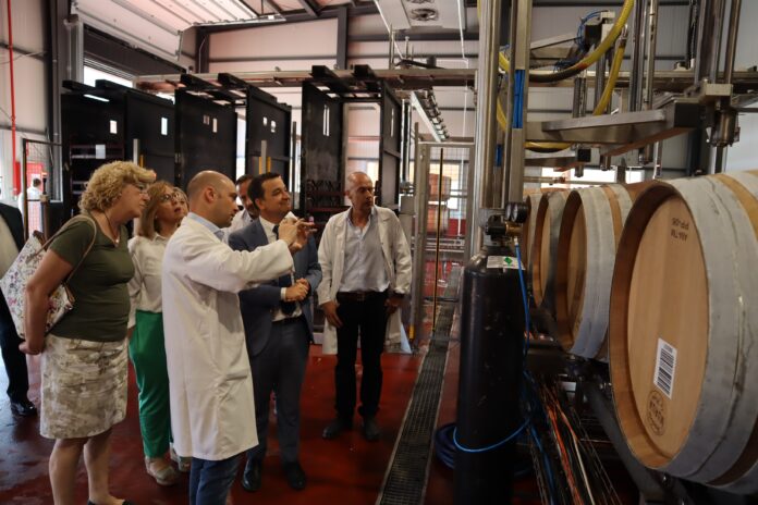Acompañado por el presidente de Félix Solís Avantis, Félix Solís, así como del director de compras, Carlos Nieto, y de la directora general de Alimentación, Elena Escobar; la delegada de la Junta en la provincia, Carmen Olmedo y la delegada de Agricultura en Ciudad Real, Amparo Bremard, entre otros, Martínez Arroyo ha recorrido las instalaciones de una infraestructura, a punto de concluirse y que ha contado con el apoyo del Gobierno regional con una ayuda inversora de cerca de 3 millones de euros dentro del último VINATI, lo que significa el 20 por ciento de financiación de la obra del almacén y todas las barricas que suponen incremento productivo para la empresa.