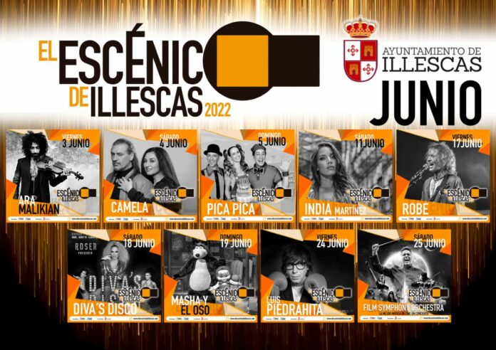 El primer fin de semana, se subirán al escenario del Espacio Escénico Cubierto, Ara Malikian, Camela y Pica-Pica. La semana siguiente, será el turno de India Martínez. El tercer fin de semana, los protagonistas serán Robe, Diva’s Disco y Masha y el Oso. El Escénico de Illescas, del mes de junio, se cerrará con el humor de Luis Piedrahita, y la música de la Film Symphony Orchestra.
