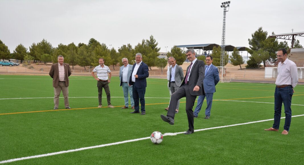Una de estas destacadas actuaciones que visitó el presidente provincial es la remodelación del campo de fútbol de la localidad donde se ha sustituido el muy deteriorado césped natural por césped artificial, para conseguir unas condiciones óptimas de uso aprovechando la intervención para incorporar criterios de sostenibilidad en referencia al empleo del agua.