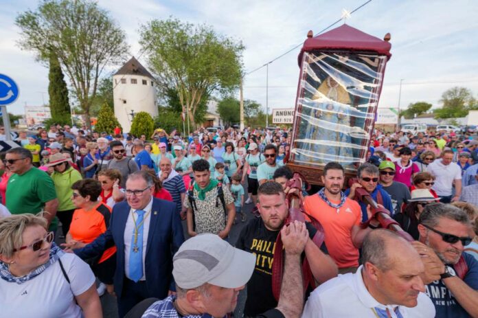 La romería, propiamente dicha, se inició superadas las 16:30 horas cuando las campanas de la ermita anunciaron la salida de la imagen a hombros de diez porteadores hasta el humilladero, donde hizo una parada para despedirse del que ha sido su hogar desde enero y comenzó a caminar los más de 12 kilómetros que la separaban de la que será su casa hasta el mes de septiembre, la iglesia de San Juan Bautista en Argamasilla de Alba.
