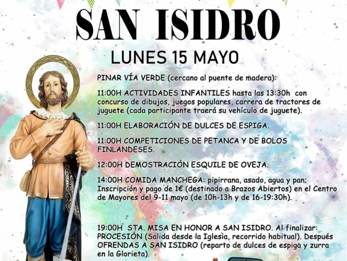 A las 19:00 h. se realizará la Santa Misa en honor a San Isidro, y al finalizar se llevará a cabo la tradicional procesión desde la Iglesia San Juan Bautista, por el recorrido habitual, finalizando en la Glorieta donde se realizarán ofrendas a San Isidro como el reparto de dulces de espiga y zurra.
