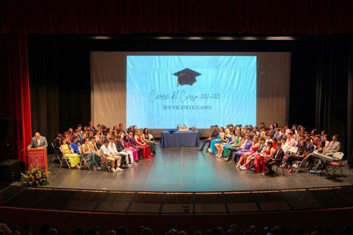 Por su parte, el director del IES Vicente Cano, Juan Francisco Berzosa, hizo referencia al poeta local que da nombre al instituto, Vicente Cano. Citando al poeta, animó a los graduados a construir castillos en el aire, a imaginar y crear barcos con mares infinitos, a hacer panes con deseos y a llenar jaulas con pájaros que olviden la tristeza, y les deseó mucho éxito en sus vidas.