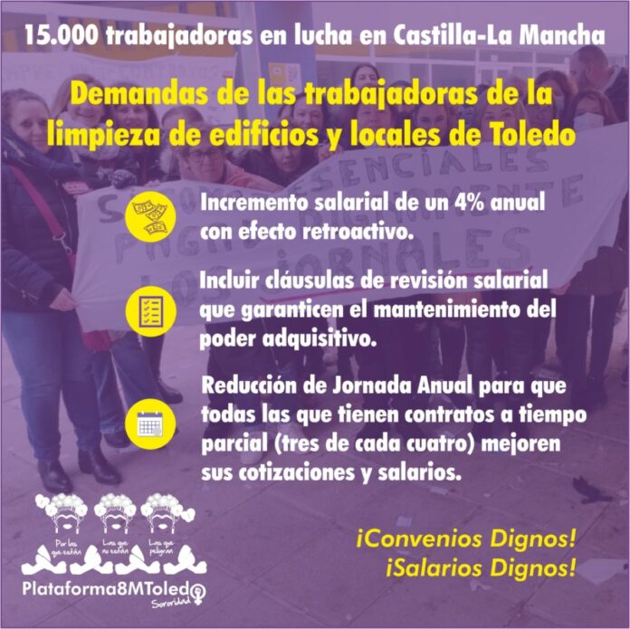 Las conoces. Son las que limpian. Las veras empujando carritos grises llenos de mochos, cepillos, bayetas de colores, bolsas de basura y un arsenal de productos químicos para mantener la higiene de las salas de espera, las letrinas, los quirófanos, los colegios, etc. Son las trabajadoras de la limpieza de edificios y locales que están luchando por un convenio y un salario dignos en Toledo y en Castilla-La Mancha y que son más de 15.000 mujeres.