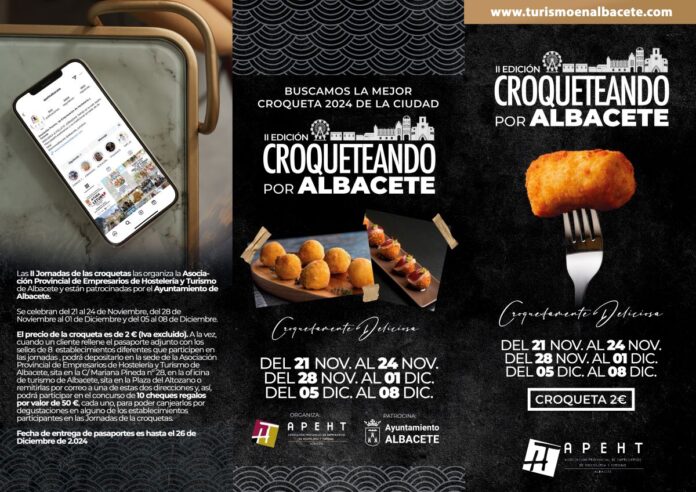 El presidente de la APEHT ha explicado que, cuando un cliente rellene el pasaporte adjunto con los sellos de 8 establecimientos diferentes que participen en las jornadas, podrá depositarlo en la sede de la Asociación Provincial de Empresarios de Hostelería y Turismo de Albacete (C/Mariana Pineda, 28), en la oficina de turismo de Albacete en la Plaza del Altozano o remitirlas por correo a una de estas dos direcciones para participar en el sorteo de 10 cheques-regalo por valor de 50 euros, cada uno, que podrán canjearse por degustaciones en alguno de los establecimientos participantes, siendo la fecha de entrega de pasaportes es hasta el 26 de diciembre de 2024 y el horario para poder degustar las croquetas de 13:00 a 16:00 horas y de 20:00 a 23:00 horas.