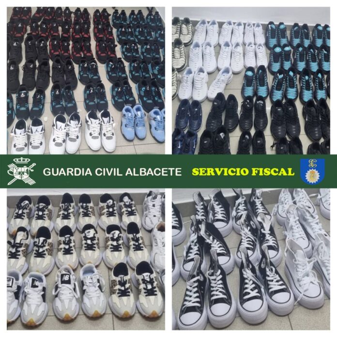 Especialistas del Destacamento Fiscal y Fronteras de la Guardia Civil de Albacete han investigado a un varón de 40 años de edad, residente en la Región de Murcia, como presunto autor de un delito contra la propiedad industrial, por vulnerar el derecho de marca. En la actuación policial se han intervenido 245 pares de zapatillas deportivas, presuntamente falsificadas.