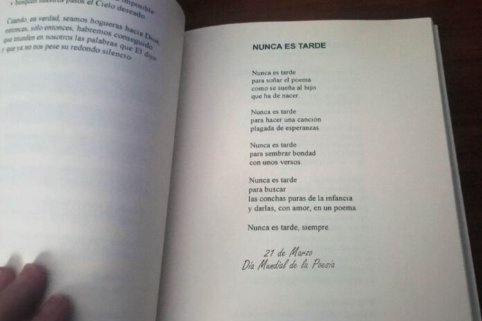El 21 de marzo se celebra el Día Mundial de la Poesía, un día que nos recuerda que “la poesía tiene el poder de dibujar nuevos amaneceres con un solo verso y escribir pentagramas que nos hacen interpretar la mejor melodía. Es un refugio, un abrigo, vida, pasión, mirada, esperanza e incluso un acto de fe”, afirma la concejala de Educación y Cultura, María José Díaz.