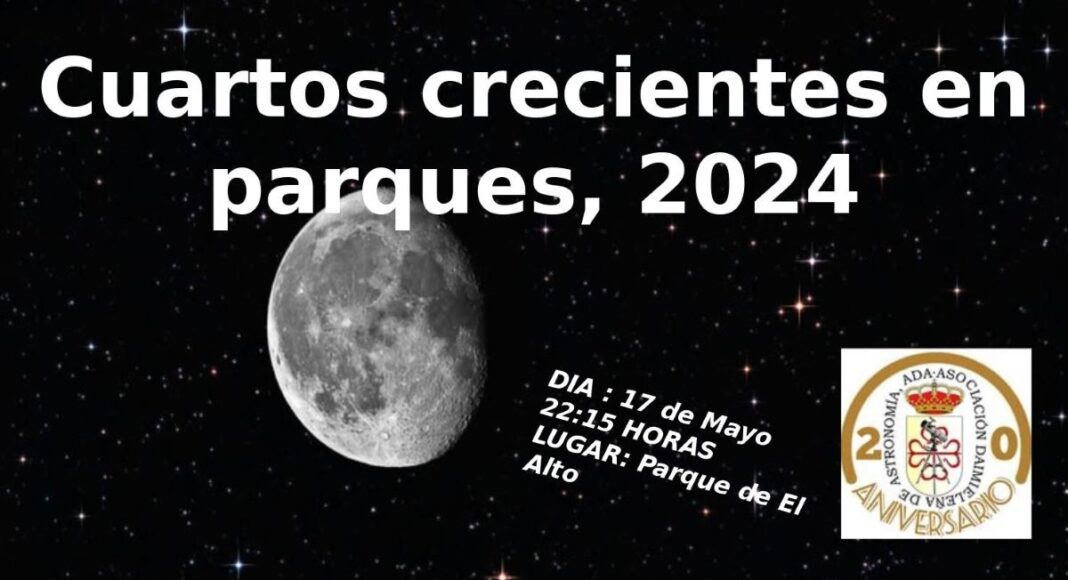 Este viernes, 17 de mayo, a las 22.15 horas se celebrará en el parque de El Alto de Daimiel (Ciudad Real) la cuarta observación ‘Cuartos crecientes en parques’, actividad que se está desarrollando dentro del marco de la celebración del XX aniversario de la Asociación Daimieleña de Astronomía.