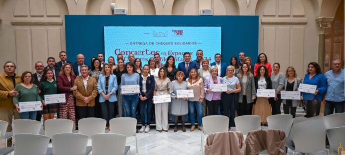 El presidente de la Diputación de Ciudad Real, Miguel Ángel Valverde, y la vicepresidenta quinta, María Jesús Pelayo, han presidido esta mañana el acto de entrega de los cheques solidarios a las quince asociaciones de la provincia que que este año se benefician de la recaudación obtenida a con el desarrollo de la actividad “Conciertos en Espacios y Lugares Emblemáticos”, que ha ascendido a 77.873 euros. Ambos han puesto en valor, ante alcaldes y representantes de los municipios sede de las actuaciones y las entidades beneficiarias, la importancia de la colaboración entre las administraciones locales y el tercer sector.