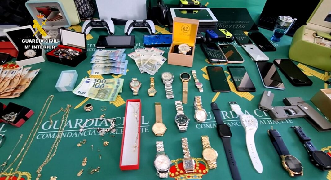 - 1.100 euros en efectivo, 33relojes, 29 piezas de joyería, 15 teléfonos móviles de alta gama, 5 tablets, 4 videoconsolas y 5bolsos de reconocidas marcas comerciales.