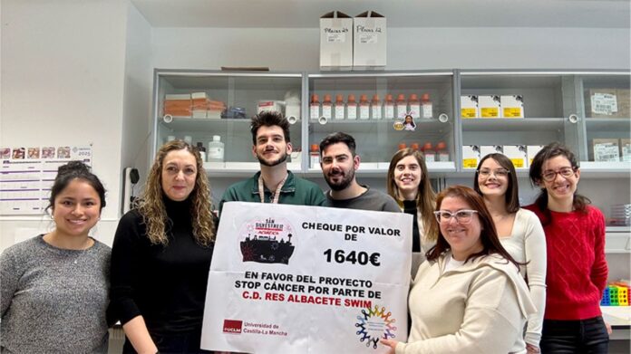 El proyecto Stop Cáncer de la UCLM ha recibido una nueva aportación económica para continuar con su trabajo de investigación que, en esta ocasión, ha llegado desde el Club Deportivo -C.D.- Res Albacete Swim, tras la recaudación obtenida durante la celebración de la San Silvestre Acuática de Albacete, un evento solidario celebrado el pasado 31 de diciembre, que reunió en la piscina Juan de Toledo a numerosos nadadores y aficionados con el objetivo de aportar esperanza a la lucha contra el cáncer cerebral.