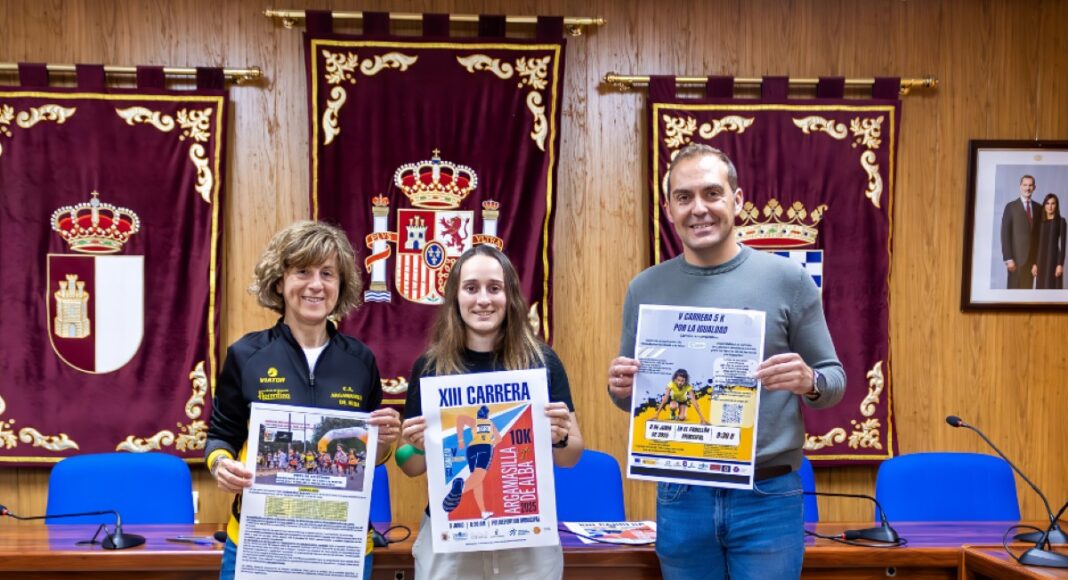La concejala de Deportes, Verónica López de la Vieja, junto al vicepresidente del Club de Atletismo de Argamasilla de Alba, Benigno Sánchez Hilario, y la vocal María Luisa Ocaña, ofrecieron una rueda de prensa para presentar los eventos deportivos que se celebrarán el fin de semana del 7 y 8 de junio, con la participación activa del Ayuntamiento en su promoción y apoyo logístico.