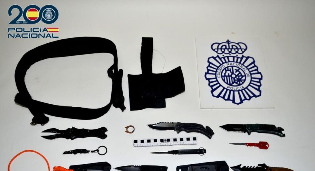 El presunto agresor intentó abandonar el lugar a la carrera siendo interceptado por los dos agentes de la Policía Nacional, quienes en el cacheo previo a su detención le intervinieron hasta siete armas prohibidas que portaba de manera profesional y dispuestas para su extracción rápida utilizando un cinturón táctico similar a los que utiliza la policía; entre las armas localizadas destacan dos navajas de tipo militar y apertura asistida, una navaja de doble hoja, un kubotán que ocultaba un puñal en su interior así como una navaja oculta en una llave.
