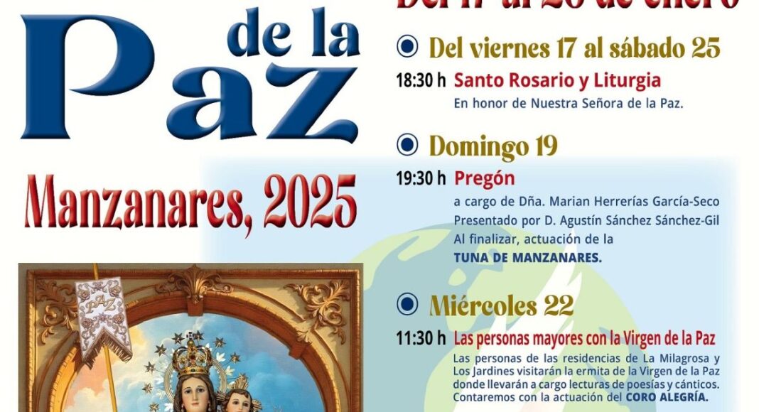 Las fiestas en honor a la Virgen de la Paz 2025 finalizarán el domingo 26 de enero con una doble cita: la eucaristía solemne a las 10:30 horas, donde participará el coro de la parroquia de Altagracia y se impondrán las medallas a los nuevos hermanos; y la procesión de la Virgen de la Paz por las calles de Manzanares, que comenzará a las 17 horas y estará acompañada por la banda de música de la AMC ‘Julián Sánchez-Maroto’.